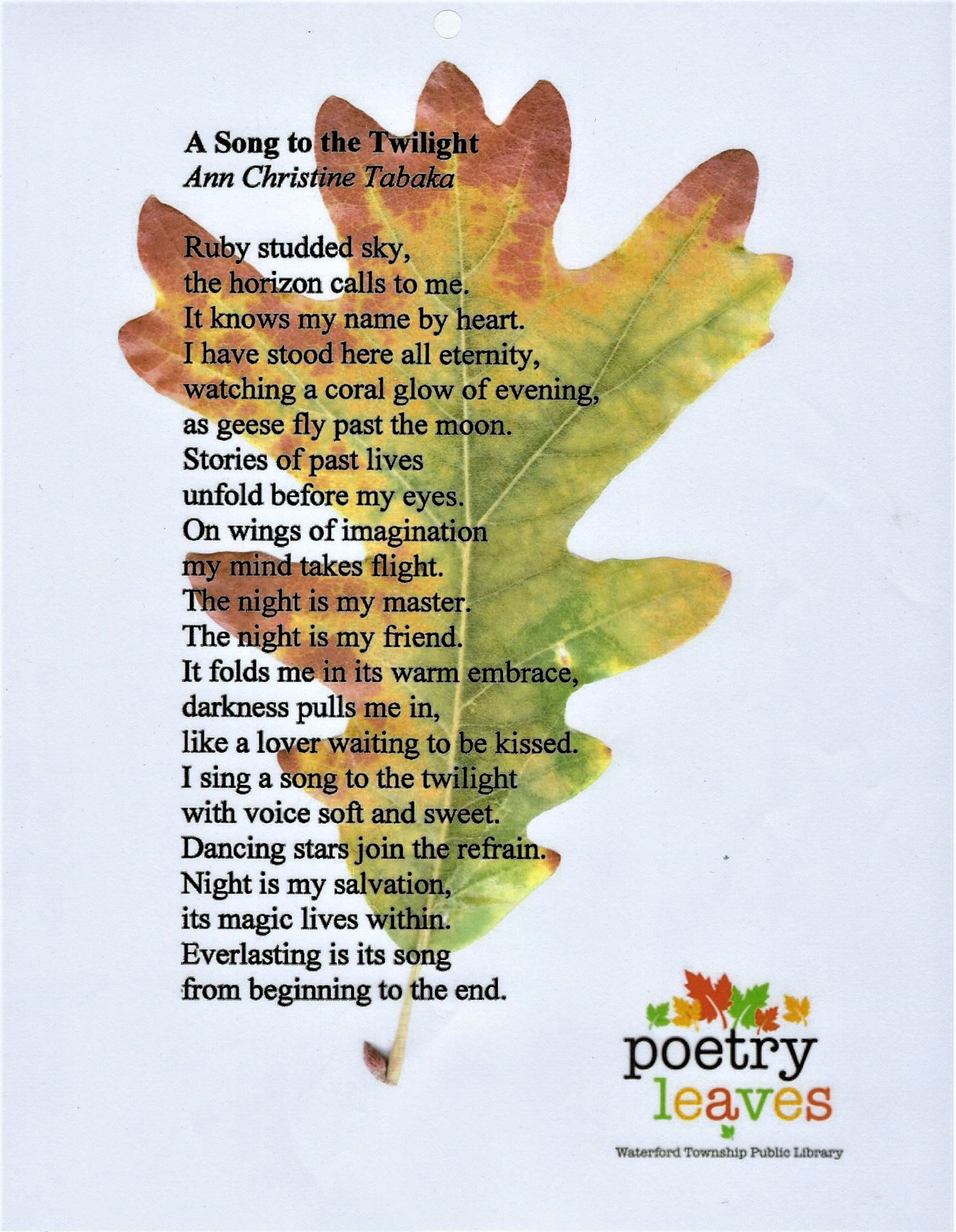 Thrilled to have my actual Poetry Leaf “A Song to the Twilight” from the 2019 “Waterford Township Public Library’s Poetry leaves Exhibit.”