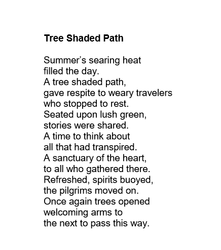 It is always a pleasure to appear at Best Poetry. Thank you editor Guy Farmer for publishing my poem “Tree Shaded Path.”
