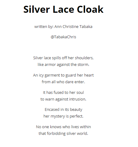 Silver Lace Cloak – published by Spillwords Posted on September 3, 2019 by Ann Christine Tabaka Thank you editor Dagmara for publishing my poem “Silver Lace Cloak” in Spillwords.Click here: Share this: Click to share on Facebook (Opens in new window) Facebook Click to share on LinkedIn (Opens in new window) LinkedIn Click to share on Bluesky (Opens in new window) Bluesky Like Loading... Related
