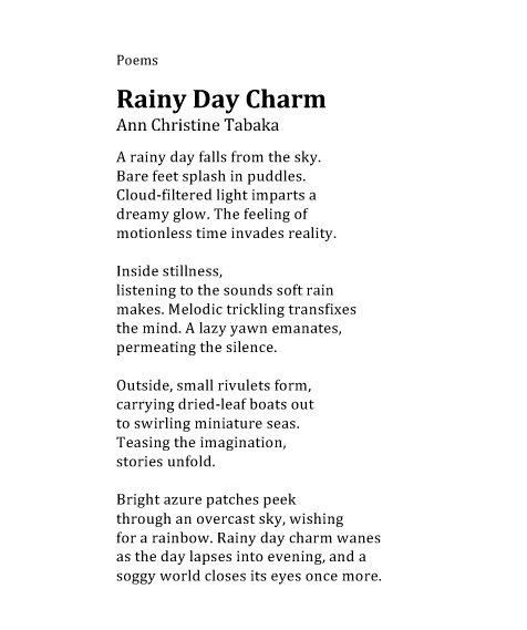 I am thrilled to have my poem “Rainy Day Charm” included in “A Walk With Nature: Poetic Encounters that Nourish the Soul” published by University Professors Press. Thank you editors Michael Moats, Derrick Sebree, Jr., Gina Subia Belton, and Louis Hoffman.