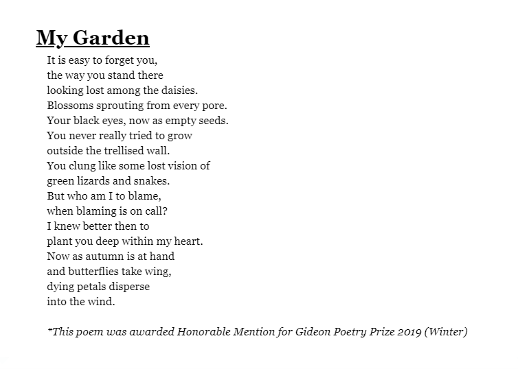 I am thrilled to announce that The Gideon Poetry Review has a new anthology out, “Poems Around Us.” I have 4 poems in it (published on their Review Site over the course of the year). The book is available on Amazon.