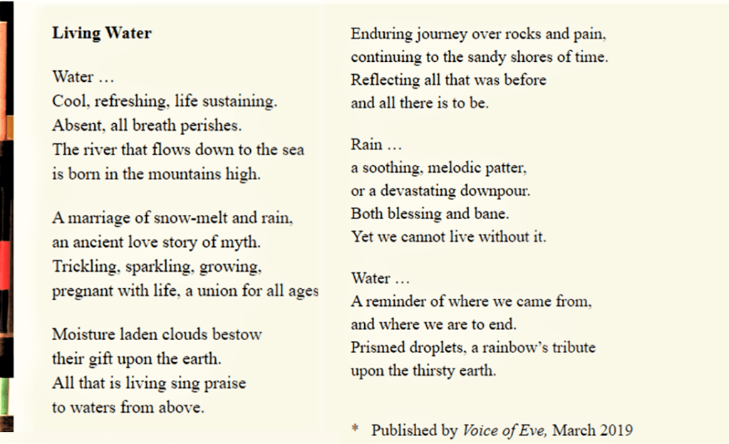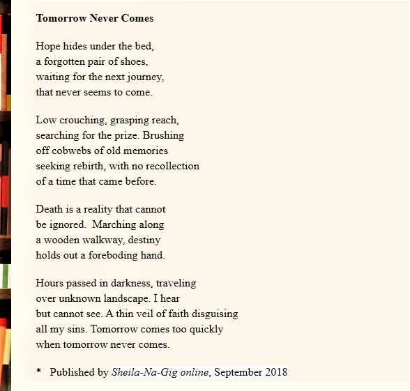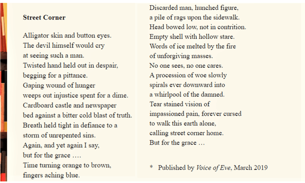 I am so thrilled to have five poems (reprints) published by The Song Is. Thank you Editor Marianne Szlyk. “Dust to Dust,’ “Living Water.” “Dry Spell,” “Street Corner,” and “Tomorrow Never Comes.”