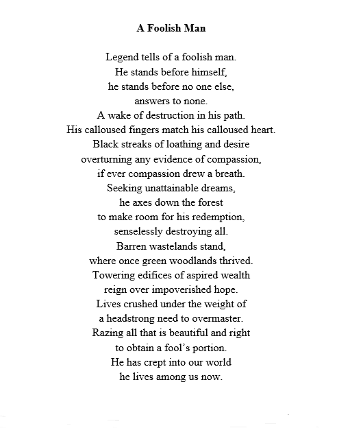 I am thrilled to have three poems published by The Writers and Readers Magazine, “He Was So Tall” [reprint], “A Fool’s Paradise” [reprint], and “A Foolish Man” (pages 45-46). Thank you, Editor Storm Grayson!