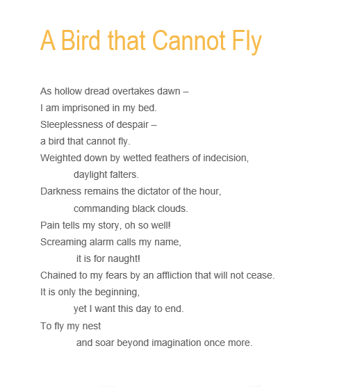 I am elated to have one of my newest poems “A Bird That Cannot Fly” published by Burningword Literary Journal. Thank you, Erik Deerly, Managing Editor!