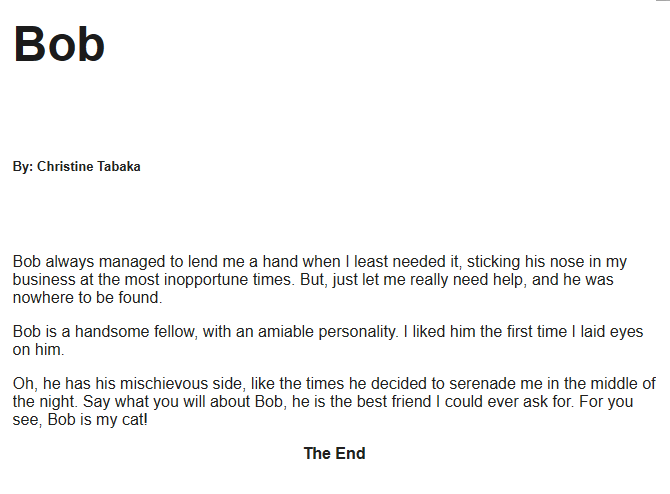 I am super thrilled to have my humorous drabble “Bob” published by The World of Myth Magazine. Thank you to the editors Stephanie J Bardy and David Montoya!