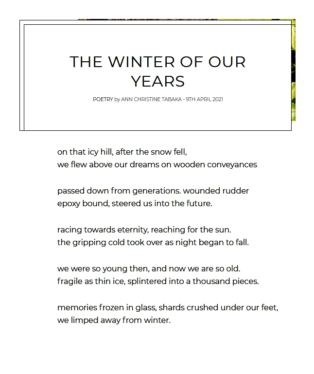 I am excited to have my new poem “The Winter of Our Years” published by Sylvia Magazine. Thank you, editor Millie Kidson!