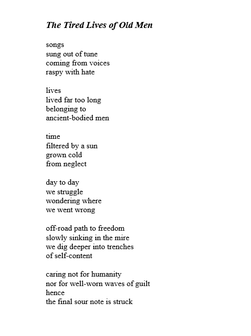 I am thrilled to have three new poems “Walking Away from Nowhere,” “Time is a Lie,” and “The Tired Lives of Old Men.” published by Former People: A Journal of Bangs and Whimpers. Thank you, Editor Christopher Derick Varn!