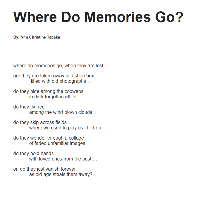 I am thrilled to have my poem “Where Do Memories Go?” published by The World of Myth Magazine. Thank you, editors Stephanie J. Bardy and David K. Montoya!