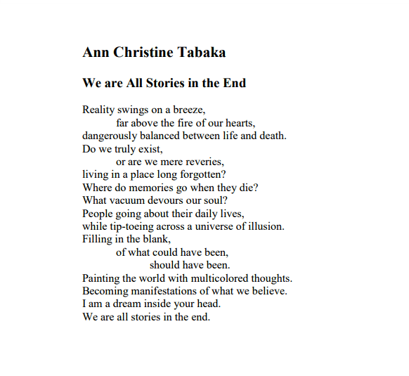 We are All Stories in the End – published by Muddy River Poetry Review Posted on October 16, 2021October 16, 2021 by Ann Christine Tabaka I am elated to have my poem “We are All Stories in the End” published by the Muddy River Poetry Review. Thank you, editor Zvi A. Sesling!Click here: Share this: Click to share on Facebook (Opens in new window) Facebook Click to share on LinkedIn (Opens in new window) LinkedIn Click to share on Bluesky (Opens in new window) Bluesky Like Loading... Related