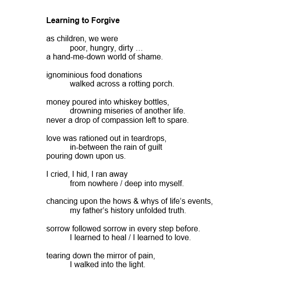 I am humbled to have my very personal poem “Learning to Forgive” published by Literary Heist. Thank you, editor Ryan D Brinkhurst.