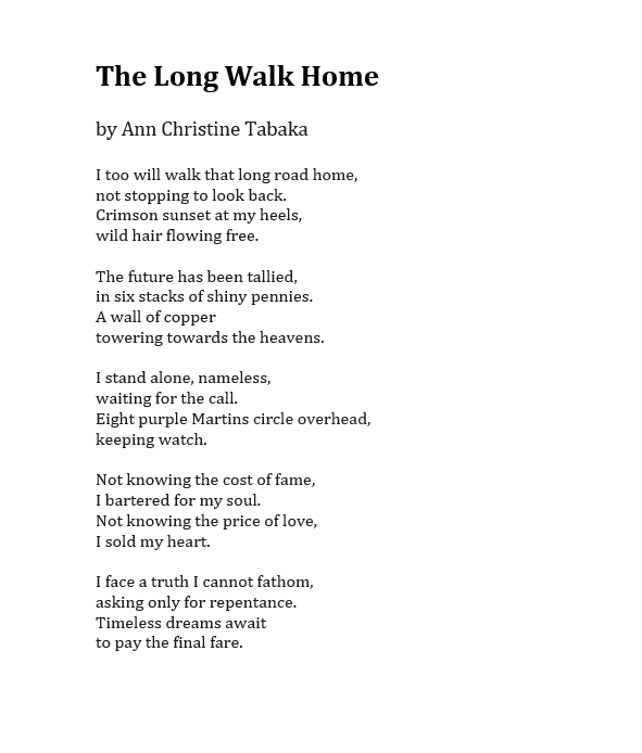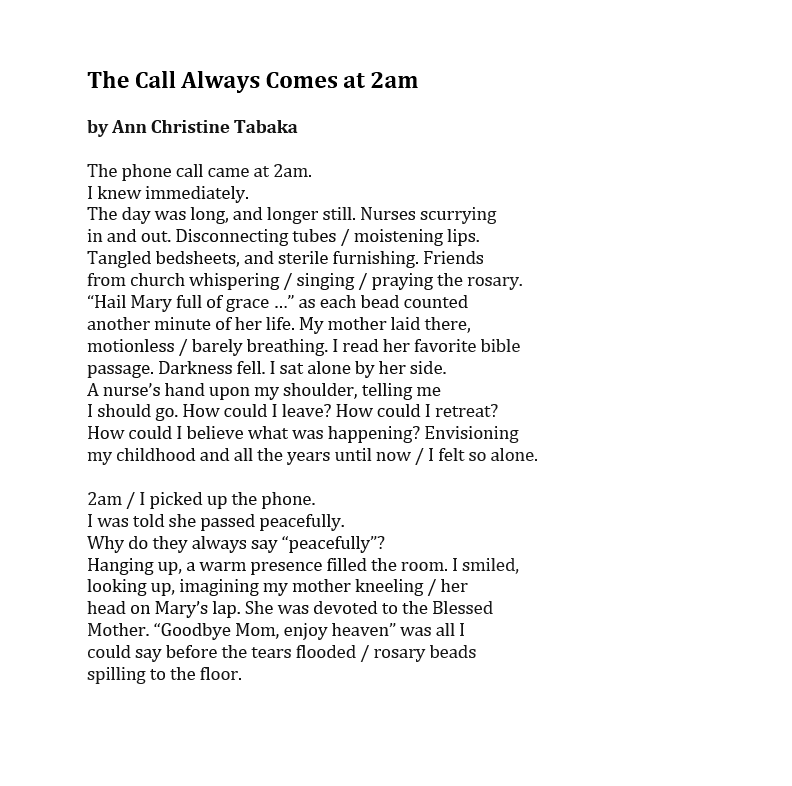 I am honored to have my poems “The Call Always Comes at 2am,” “The Long Walk Home,: and “From My Front Door” published by Agape Review. Thank you, Team Agape Review.