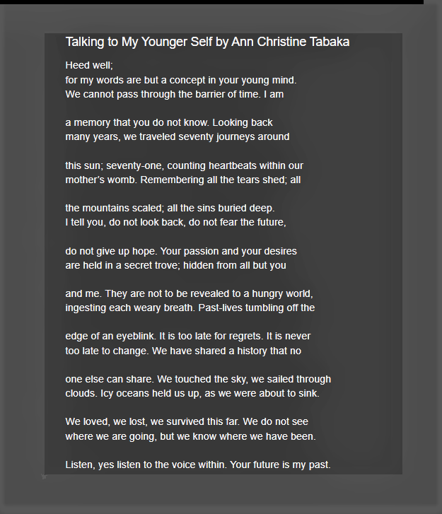It is always a thrill to have a poem published in The Rye Whiskey Review. Thank you, editor John Patrick Robbins for publishing my poem “Talking to my Younger Self.”