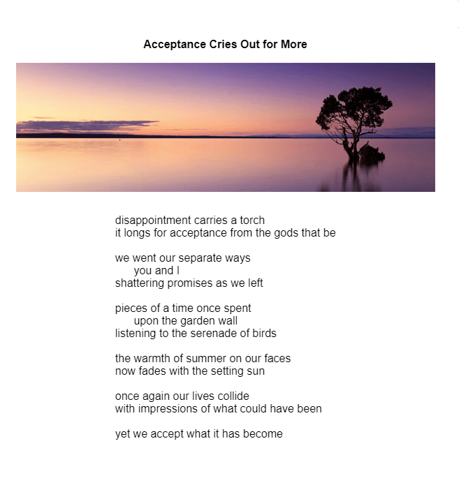 Thank you, editor Sand Pilarski for publishing my poem “Acceptance Cries Out for More” (reprint) in The Piker Press!