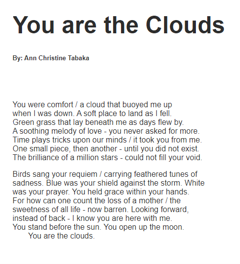 I am thrilled to have my poem “You are the Clouds” published by The World of Myth Magazine. Thank you, editor Stephanie J. Bardy.
