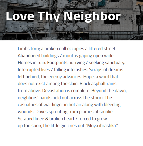 I am honored to have my poem “Love Thy Neighbor,” a poem about the war in Ukraine, published by Literary Heist. Thank you, editor, Ryan D Brinkhurst.