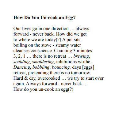 I am elated to have my poem “How Do You Un-Cook an Egg?” published by StreetCake Experimental Writing Magazine. Thank you, Managing Editors, Nikki Dudley & Trini Decombe.
