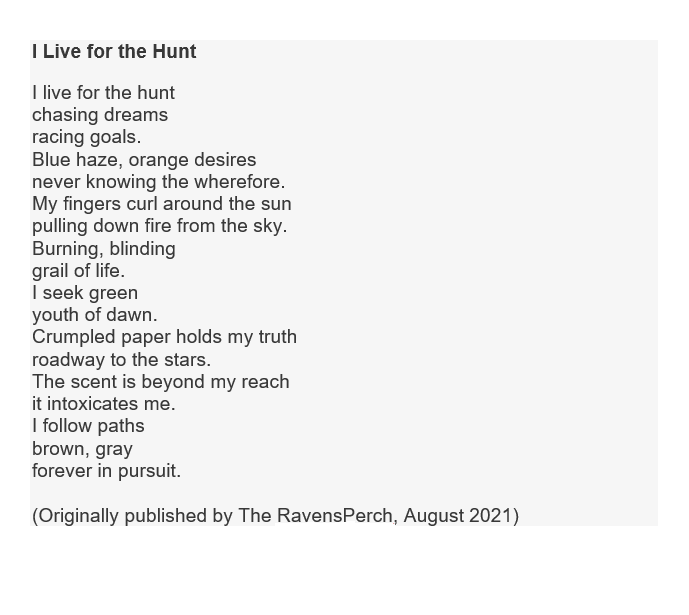 I am thrilled to have my poem “I Live for the Hunt” (reprint) published by Fixator Press. Thank you, editor Jonathan Butcher.