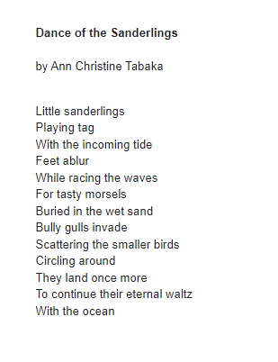 I am thrilled to have my poem “Dance if the Sanderlings” published by Writing in a Woman’s Voice. Thank you, editor Beate Sigriddaughter.