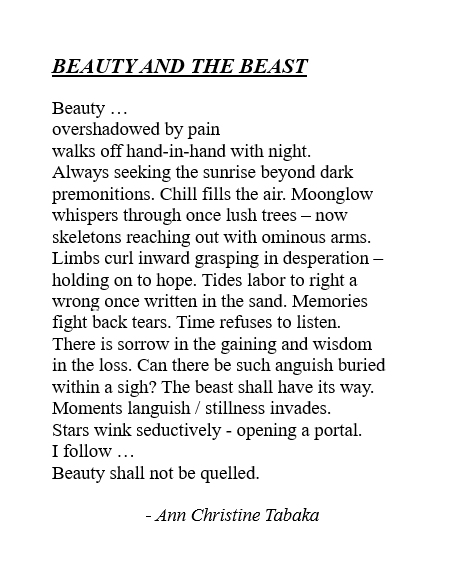 I am ecstatic to have my poem “Beauty and the Beast” published by Ibbetson Street Magazine in issue #56. Thank you, poetry editor Harris Gardner, and editor Doug Holder.