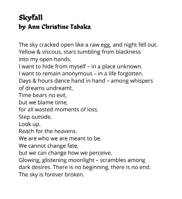 I am excited to have my poem “Skyfall” (page 5) published by the Qutub Minar Review. Thank you, editor Som.
