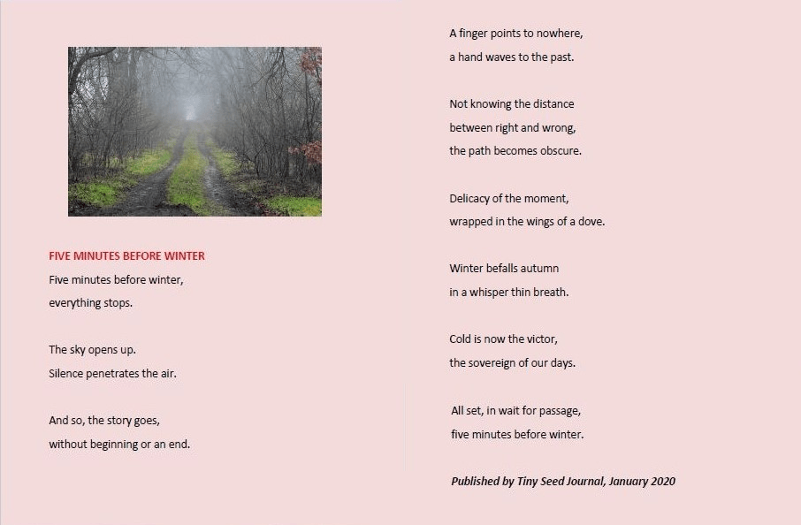 I am thrilled to have my poem “Five Minutes Before Winter” (reprint) published by GloMag. Thank you, editor Glory Sasikala.